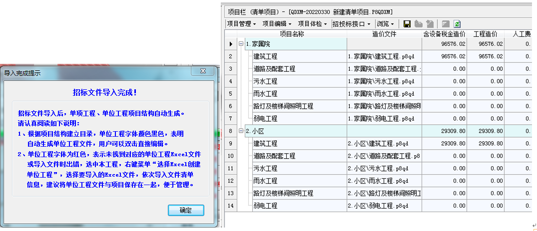 项目文件中含有的所有单位工程的内容实现了一键导入,包括了分部分项清单、措施项目清单和其他项目清单部分。 需要注意:EXCEL文件中需要有单项工程费汇总表及其对应的单位工程excel数据。(主要是为了保证按照相应的结构建立生成造价文件)